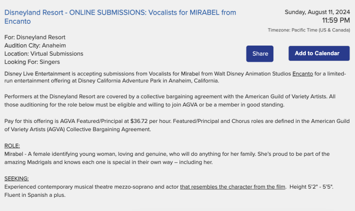 The notice says this is for a “limited-run entertainment offering,” but it doesn’t say exactly what kind of entertainment offering it will be. It COULD be a show, or it could be something else. Maybe it’s even something for the holiday season? We’ll certainly be keeping an eye out for more announcements regarding this new entertainment thing, whatever it is. Perhaps an Encanto singalong is coming to the West Coast like the one in EPCOT? Who knows?