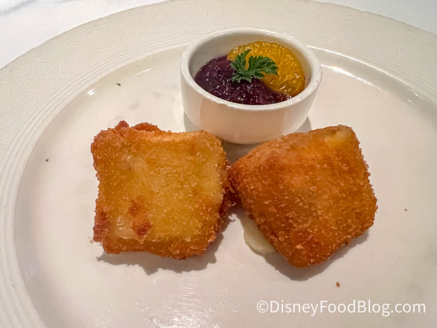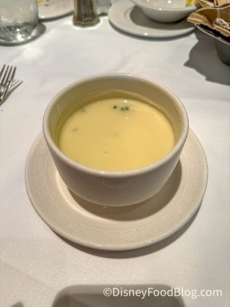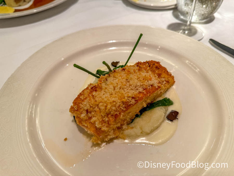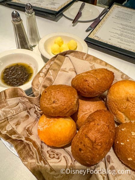 First up, our dinner started with a bread service which means we got to partake in Warm French Country Bread with an Olive Spread (this has to be our least favorite bread service on a Disney cruise). This bread was a bit too crusty on the outside, but confusingly it wasn’t very crunchy, which wasn’t the most pleasant of experiences.