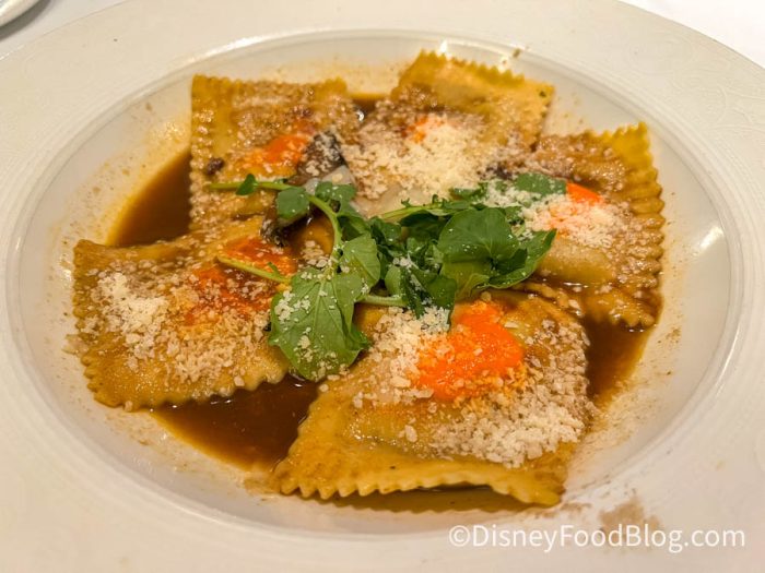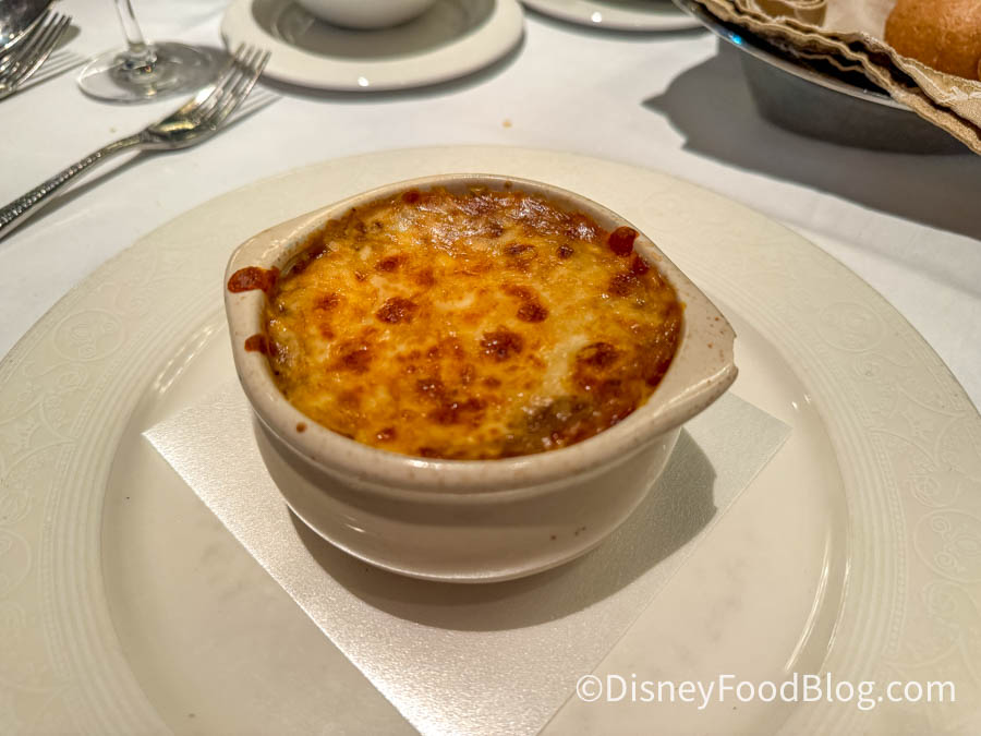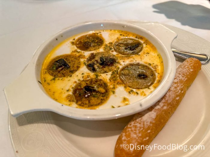 Next, let’s talk about Gaston’s Escargot Gratinée. It is lightly salty and mushroomy. Hands down, it is one of the best appetizers aboard Disney Cruise Line (and that’s saying a lot since we normally don’t go for a dish with this type of flavor). Everyone raves over its chewiness and juiciness. You’ll be served bread with it to help soak up all the butter. Our bread was a bit tough, though.