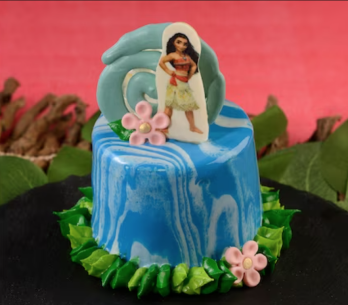 - Moana Mini Cake: Vanilla cake, mango mousse, glaçage, buttercream, fondant, white chocolate décor, and a white chocolate Moana