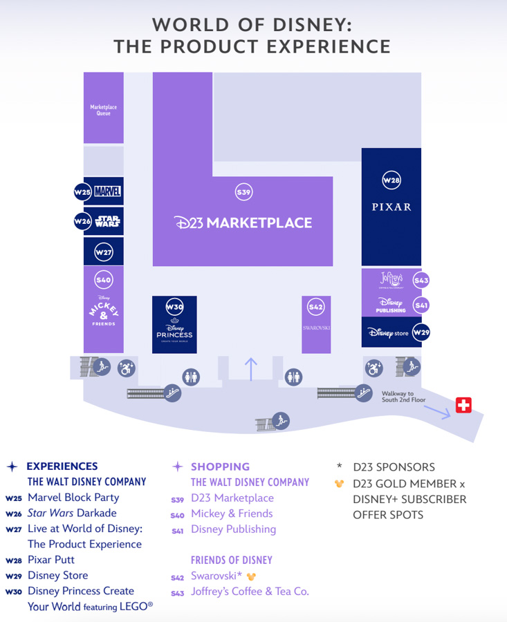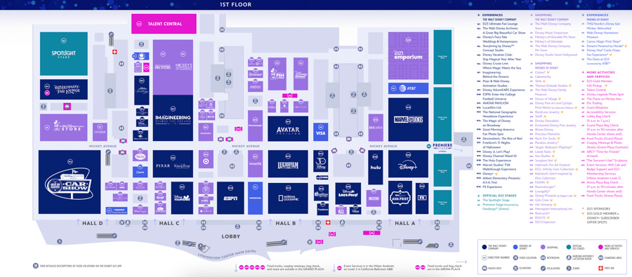 The D23: The Ultimate Disney Fan Event will take place in Anaheim, California. The event runs from August 9th through August 11th, 2024. Disney previously released a general schedule of the main events, including highlights like the Disney Experiences Showcase on August 10th, but now we’ve got the FULL MAP and guide! It all starts on the First Floor, which is where you’ll find all sorts of experiences, shopping, and more in the Main Expo Hall.
