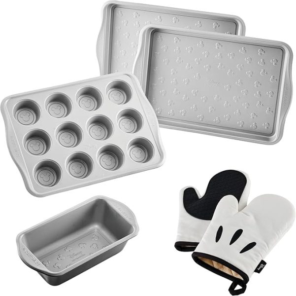 Alright, for those of you out there who need all new pans to complete your baking endeavors, the Farberware Disney Bake with Mickey Mouse Nonstick Bakeware Set is perfect! It comes with two cookie pans, one 12-count cupcake/muffin pan, a loaf pan, and a set of Mickey oven mitts.