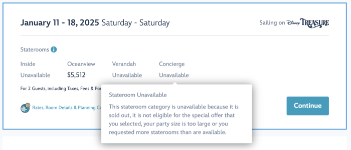 As we said earlier, there are currently sailings starting on December 21st, 2024 all the way through June 6th, 2026. We found 11 dates (as of right now) that have staterooms that are sold out. Here they are and which staterooms are unavailable: