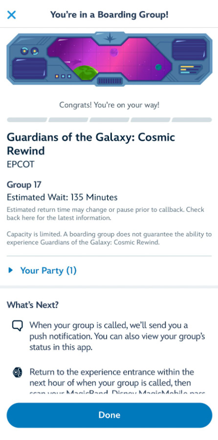 The Lightning Lane Single Pass we purchased was able to be redeemed between 9AM and 10AM — but the Virtual Queue boarding group we were placed in had an estimated callback time of 9:16AM. This was right in the middle of our Lightning Lane return time! In the past, the Genie+ system hasn’t allowed for overlapping plans like this, but it seems that has changed.