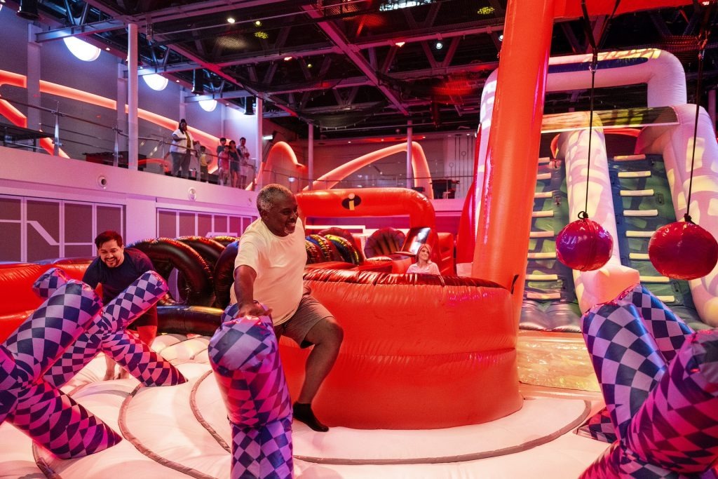 The Hero Zone is a futuristic sports arena where you and your family can compete in obstacle courses and free-play sports with a theme inspired by The Incredibles.