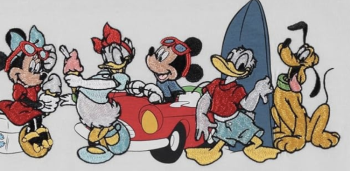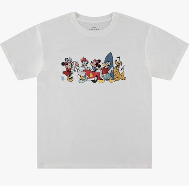 We love the fun, summer vibes the gang is giving off here, too — makes us want to hit the beach! Minnie, Daisy, Mickey, Donald, and Pluto are all featured in the embroidered design. The fit is pretty true to size and because it’s entirely cotton, it’s perfect for those HOT days at Disney World.