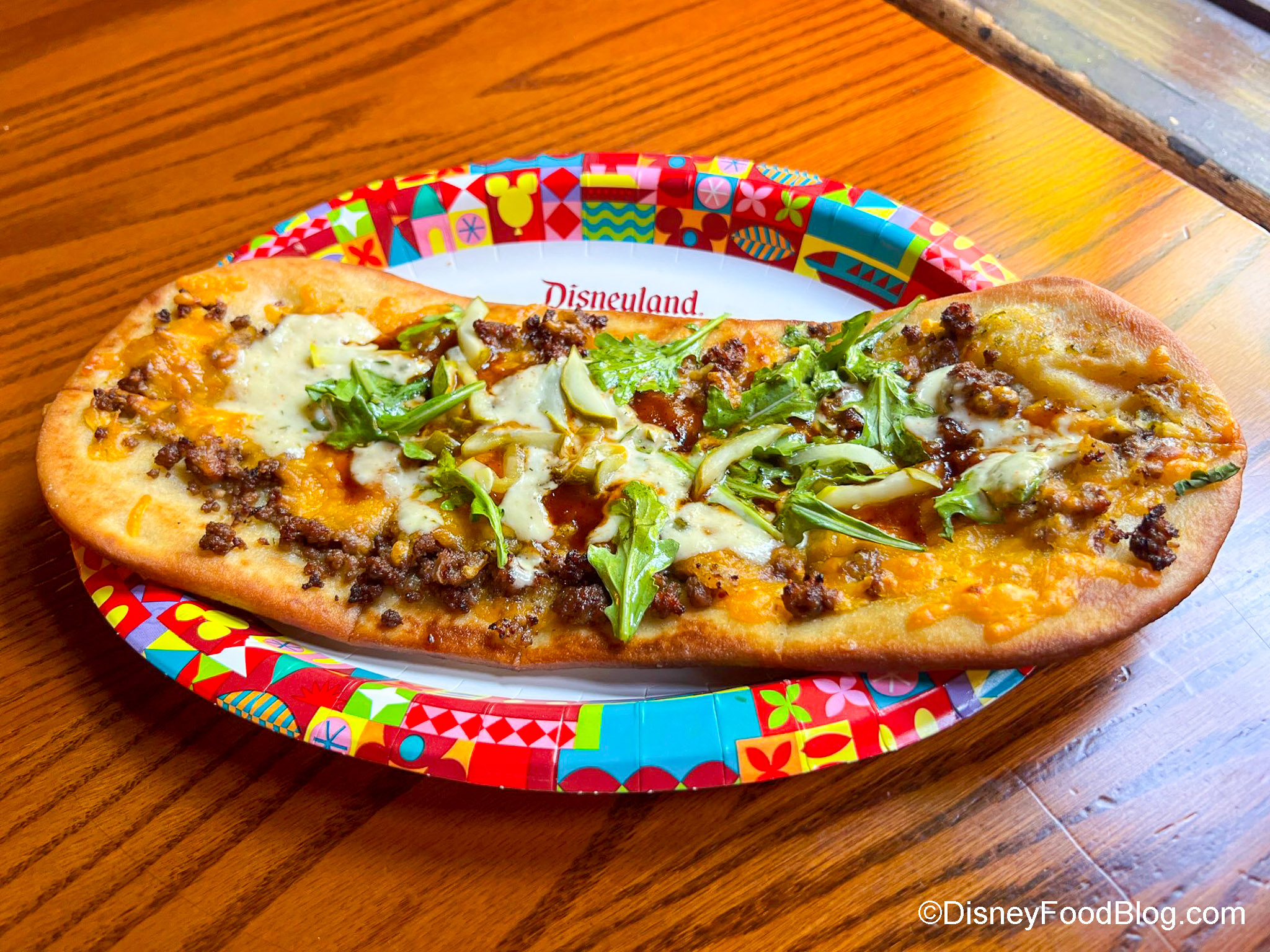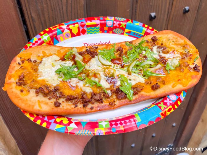 In these photos, it might not look like there’s not a lot of meat, but believe us — it’s there. It’s just covered with all that cheese (which we have zero complaints about). This is certainly not our favorite Disney flatbread, though, and maybe a cheeseburger just shouldn’t be turned into a pizza.