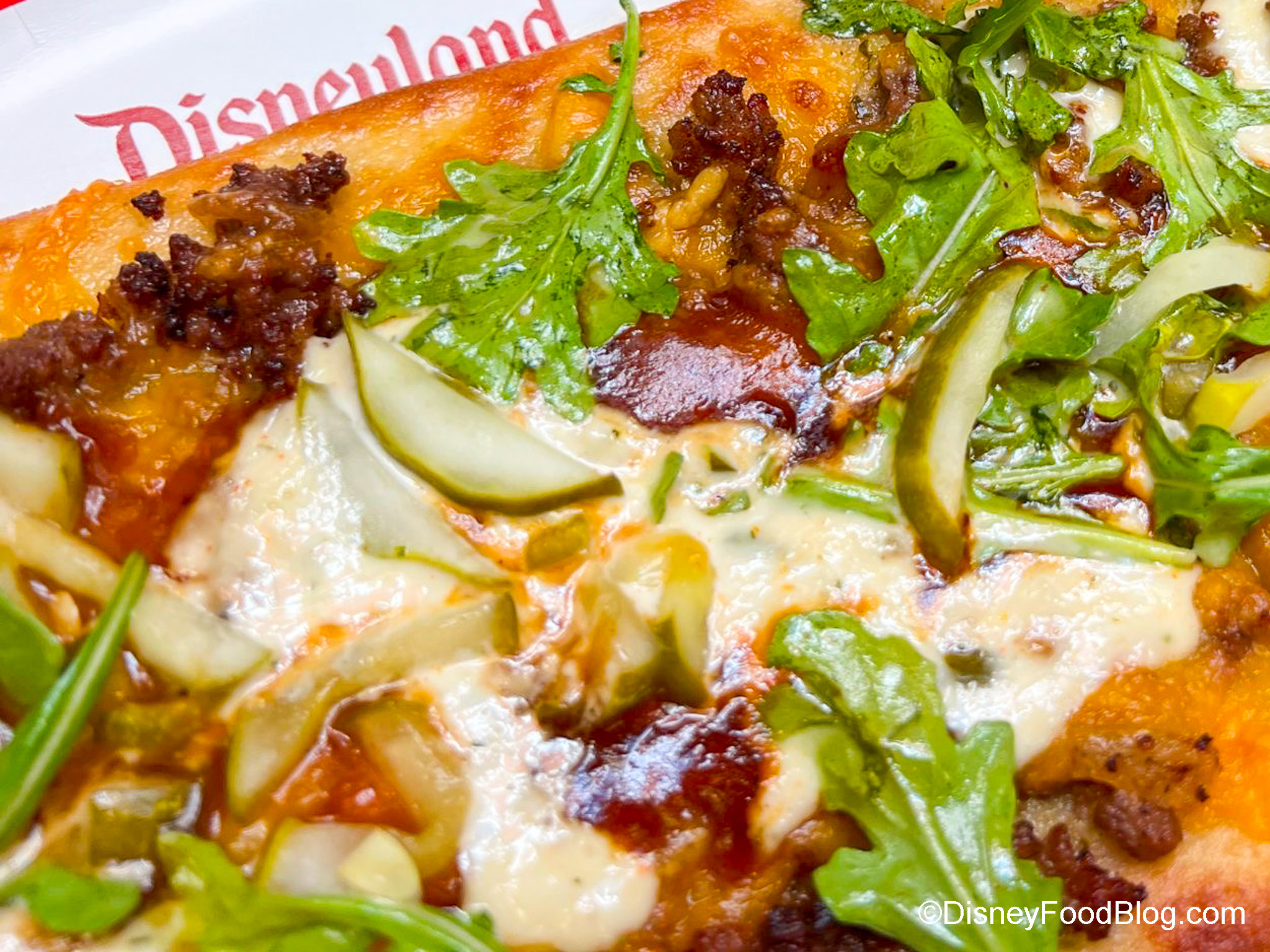 For example, we’re still completely intrigued by the Pickle Corn Dog from Blue Ribbon Corn Dogs in Downtown Disney that comes with a peanut butter dipping sauce. Plus there are some really interesting flavor combinations happening in San Fransokyo Square at Lucky Fortune Cookery, where Mexican food meets Asian food: Birria Ramen? OKAY. Well, we’ve found a new combination that combines a cheeseburger with pizza, and, well, let’s talk about it.