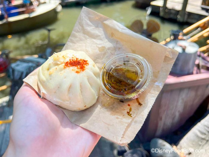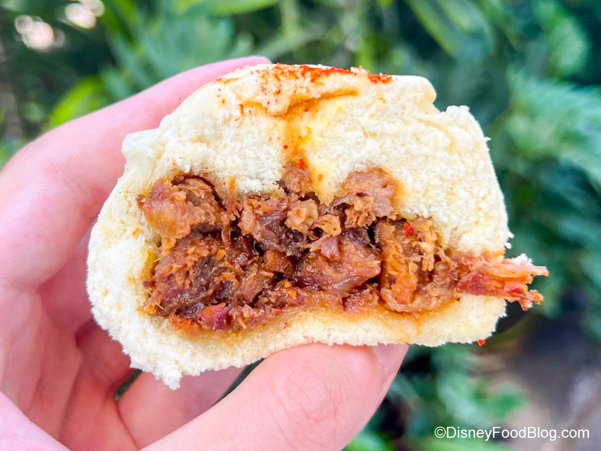 Inside, you’ll find warm, sweet pork. YUM. That pork is SO tender, too. The sauce has a brown sugar-like flavor and adds a nice sweetness when you dip the bao in it. However, this does pack a little heat, so it may not be the best snack for a hot day (and the sauce makes it even more spicy). Yes, this has a bit of a kick. The paprika on top just adds a light flavor, though.