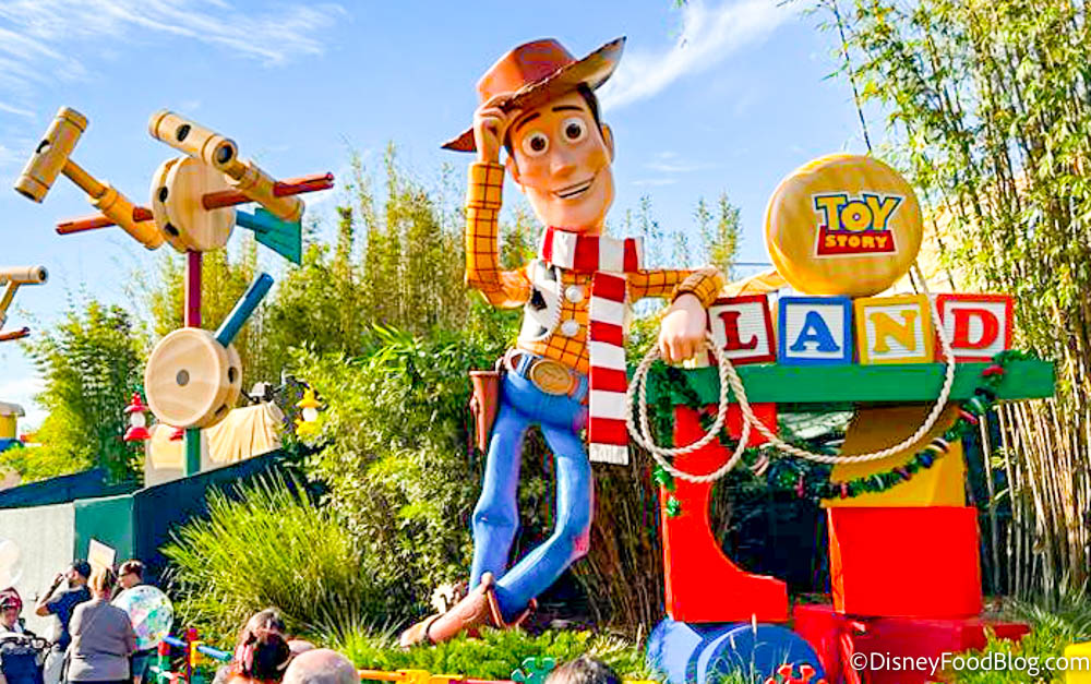We’re picking on Toy Story Land specifically because we REALLY don’t talk as much about their festive decor as we should. And that’s a shame because it’s SO STINKING CUTE. During past holiday seasons — since this area of the park first opened — Woody has greeted Hollywood Studios guests while sporting a white and red striped scarf
