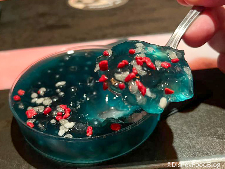 And — here’s the one we RARELY ever get the chance to talk about — the non-alcoholic Oga’s Obsession made of lemonade, cotton candy flavoring, and blueberry popping pearls with a bursting dried fruit mixture. This thing looks like I could put it under a microscope and study it in a science class. It’s FREAKY looking — and really ISN’T a drink at all. It’s more like a little jello cup… which could throw some folks off who aren’t expecting that texture.