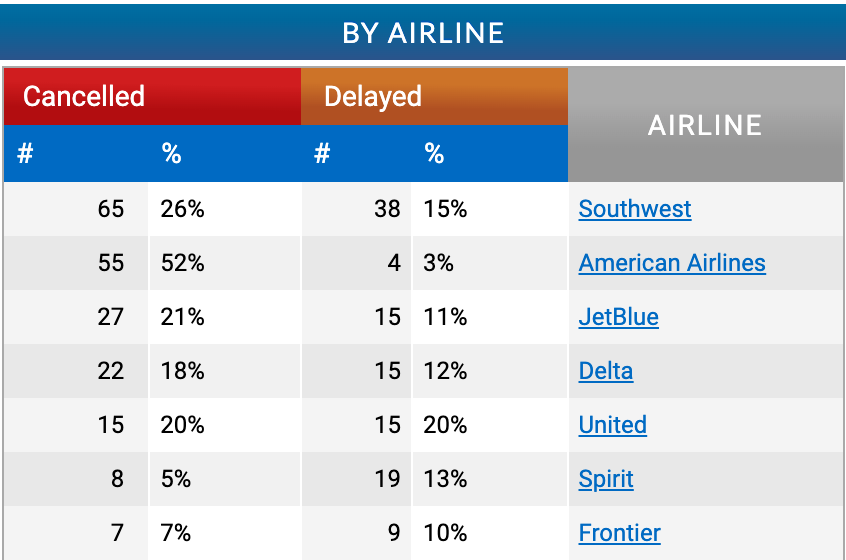 Again, today, Southwest Airlines is taking the largest hit on both delays and cancelations with American Airlines and JetBlue right behind them.