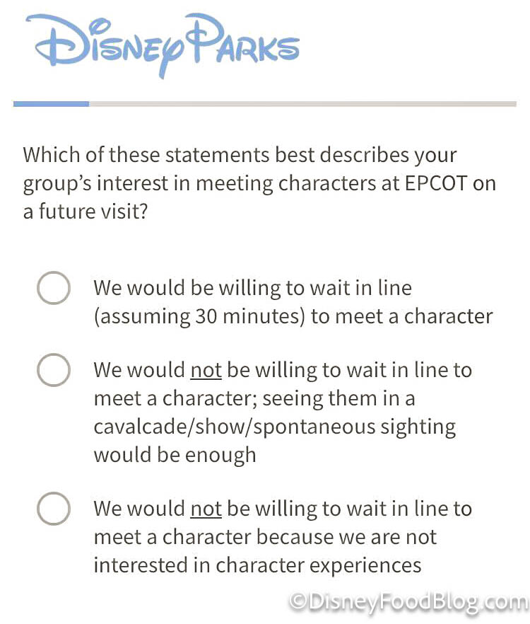 After a recent visit to EPCOT, one member of our team received a survey about her trip from Disney Parks. Among the questions was one asking about meeting characters. It asked us to rate our interest in meeting characters in the park, and whether or not we’d want to wait in line to meet them.