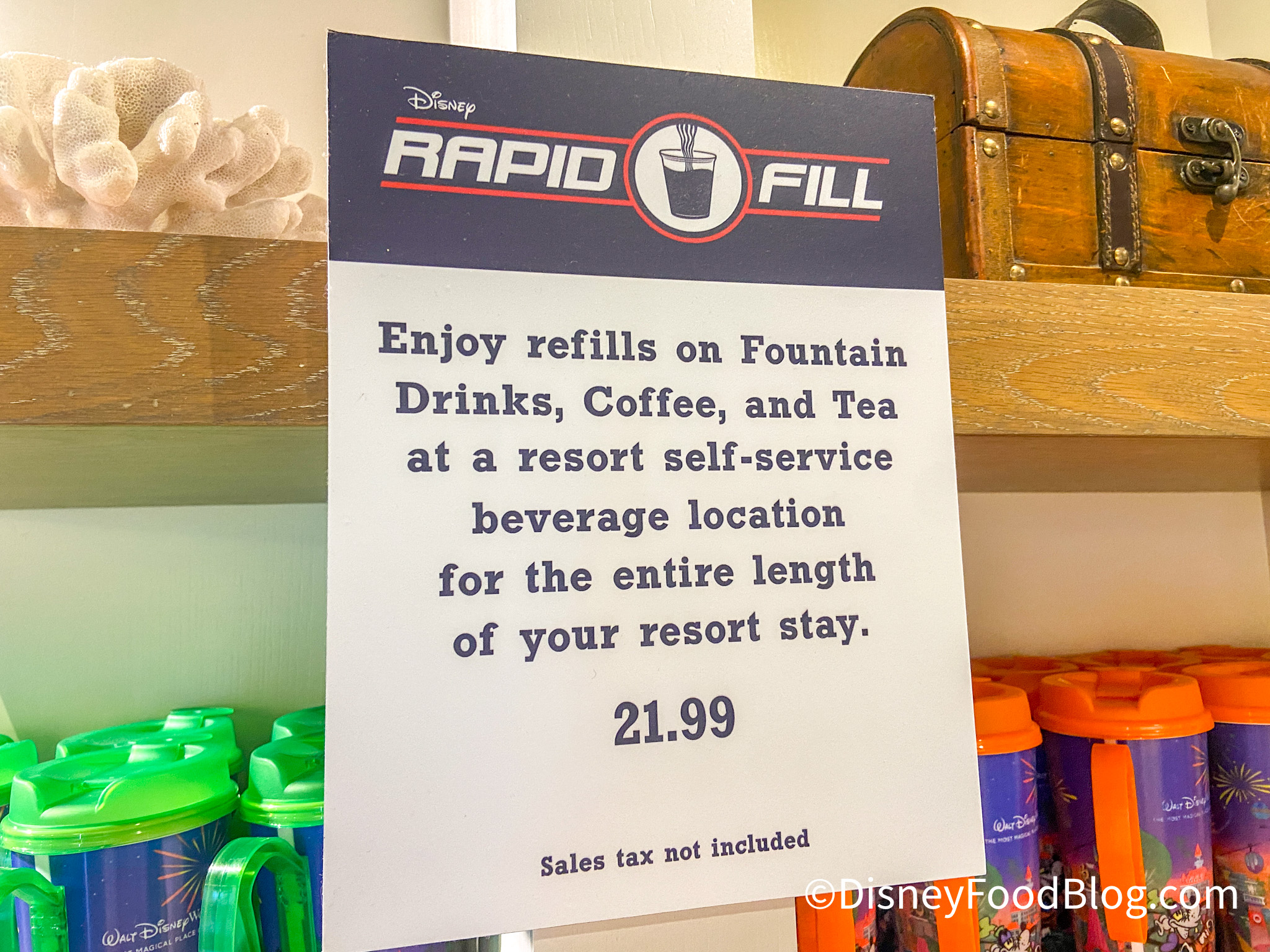 Now, we know that sometimes we say that the Refillable Mug is sometimes not worth it when you are staying at Disney World. At both Disney World and Vero Beach, you can purchase a Refillable Mug, also known as a Rapid Fill Mug, for $21.99. This mug grants you unlimited soda, tea, and coffee refills.