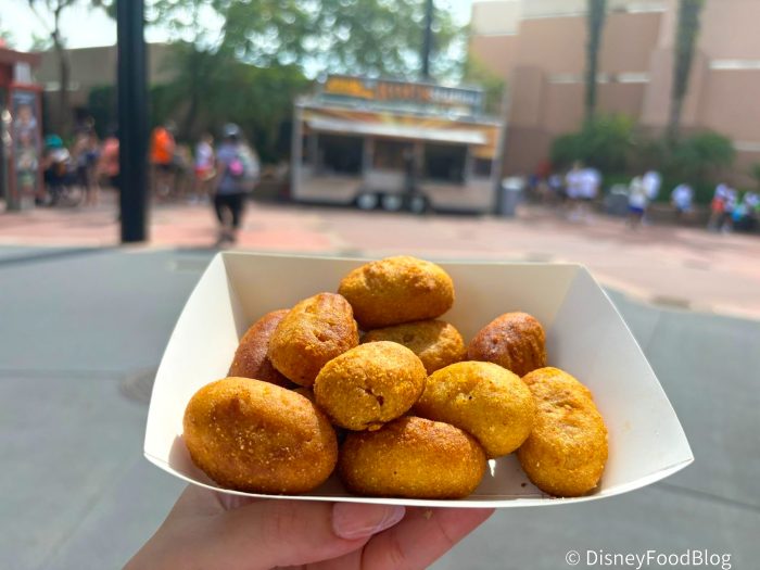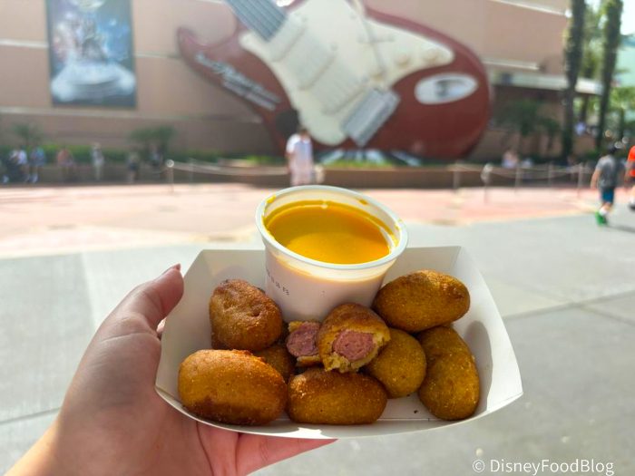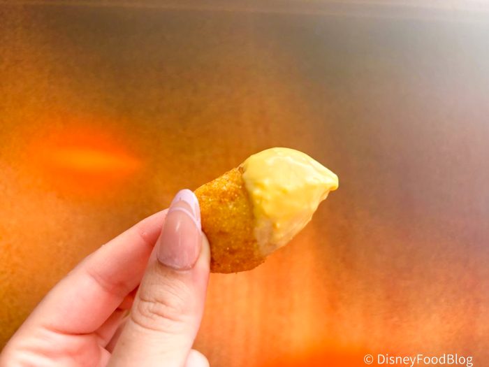 The corn dog nuggets taste just like the ones at Casey’s Corner in Magic Kingdom, and because of that, they’re just as yummy. The breading isn’t too crispy, and it’s the perfect ratio of breading to meat. The cheese, however, is where the big difference lies.