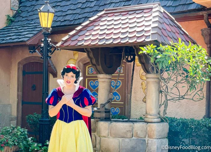 The setting of Disney’s original animated film, Snow White and the Seven Dwarfs, is inspired by several areas around Germany. This is why you’ll possibly see Snow White hanging out by the wishing well near the German pavilion at select times throughout the day.