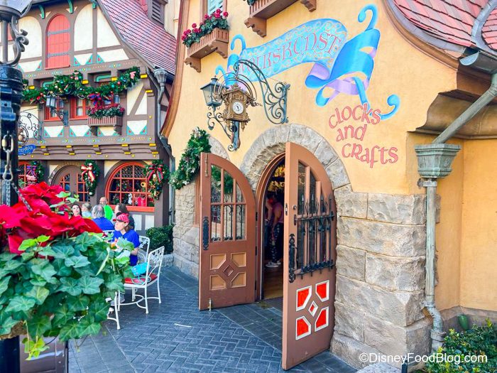 But Snow White isn’t the ONLY character from her movie hanging out around these parts. High above the merchandise inside the Volkskunst Clocks and Crafts shop, you can find Snow White’s arch nemesis… that dastardly poison apple.