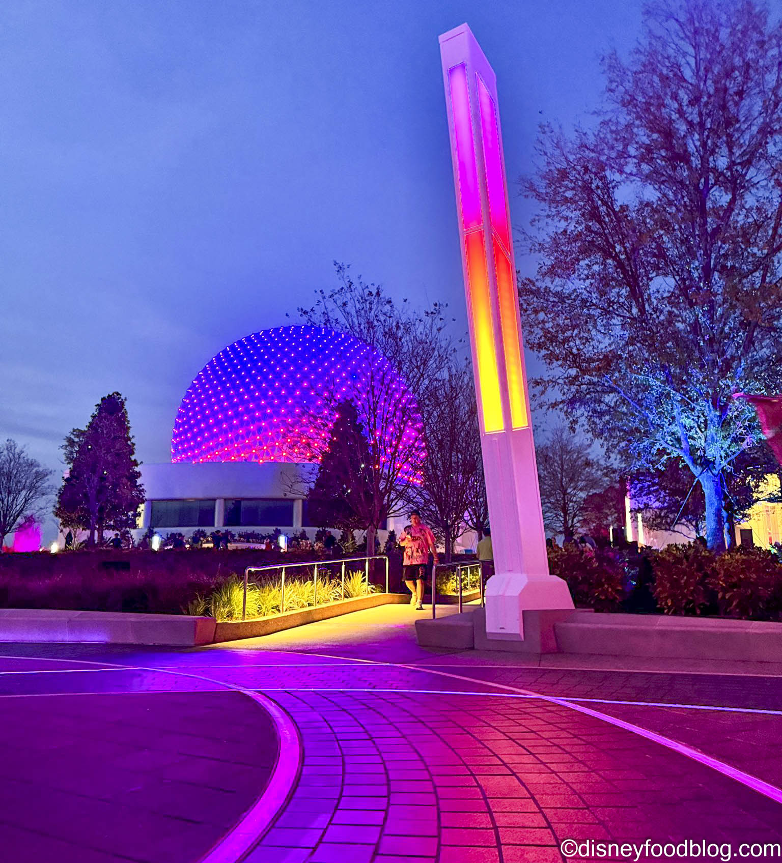 But our absolute FAVORITE part about this new section doesn’t happen until the sun sets. After sundown, 300 LED lights embedded in the pavement around World Celebration Gardens — as well as the towering light poles — illuminate this new space and synchronize with Spaceship Earth’s Points of Light show (which happens continuously throughout the night, as well).