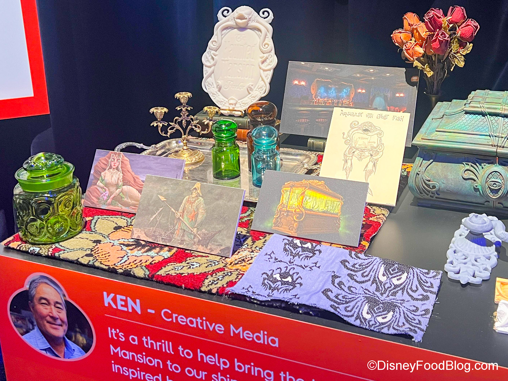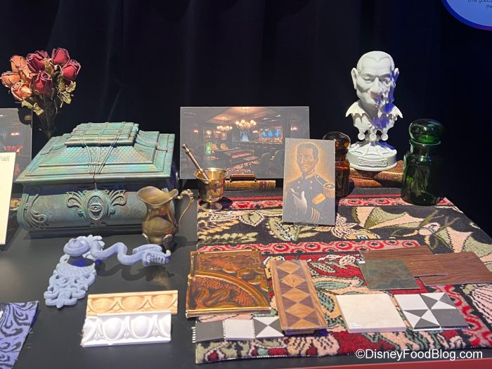 We also got a first look at some of the design elements of the Haunted Mansion Parlor, which might be the thing we’re excited about the most! There was a table with many of the decor elements laid out on it, including a bust (with half of its face melting!), wallpaper samples, flooring samples, tiles, and other design elements. SO cool.