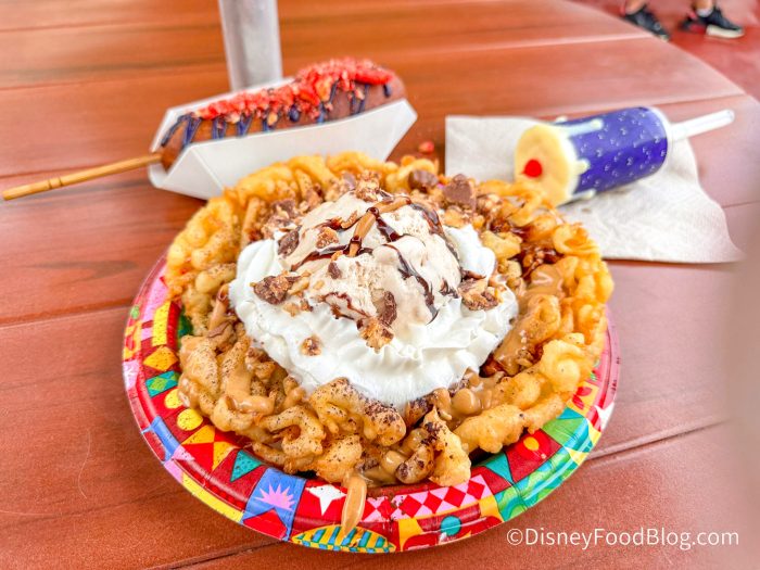 Over at Sleepy Hollow Refreshments during the party, you can find a hand-dipped corndog with spicy violet mustard and spicy cheese-flavored snacks, char siu chicken wings, the Madam Leota séance candle, and the dulce de leche, peanut butter, and chocolate sauce funnel cake!