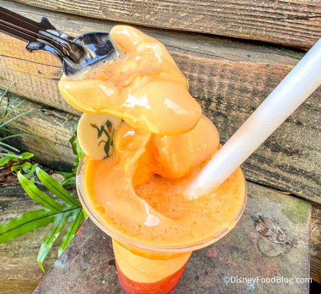 OK, we were VERY impressed with this dessert! This may go down as one of our favorite DOLE Whip floats (it’s got the makings of a top 5 treat). The first few sips were pure heaven; there’s plenty of sweet orange flavor mixed with a tart, tangy wild berry flavor that gives the DOLE Whip the perfect amount of zing. The wild berry flavor syrup mixes with the Fanta Orange in an unexpectedly perfect way — the combination of the juicy, fruity wild berries and the sweet, citrusy orange soda is fantastic. 🍊