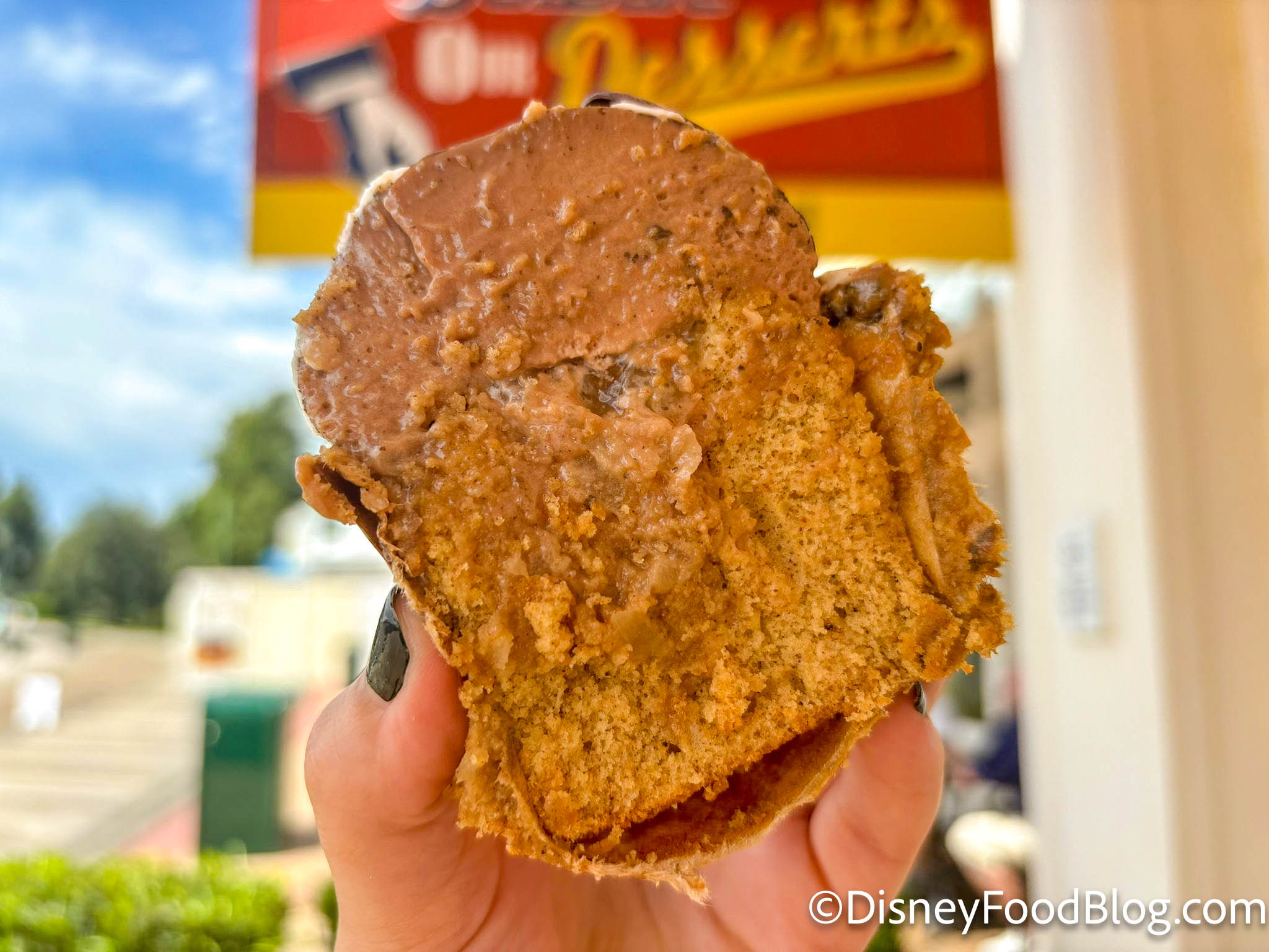 During recent visits to Disney’s BoardWalk, we tried out not one, but TWO special seasonal snacks. First up was the Halloween Mummy Cupcake from BoardWalk Deli for $6.49. It’s a spiced vanilla cupcake with apple compote and milk chocolate mousse.
