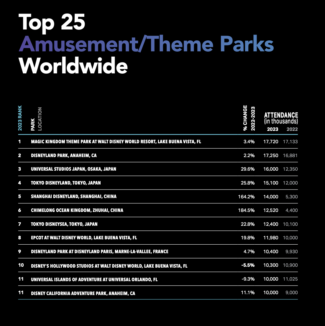 Overall, Disney holds eight out of the top ten spots for most visited parks worldwide and four out of the top five spots for most visited parks worldwide AND in North America.
