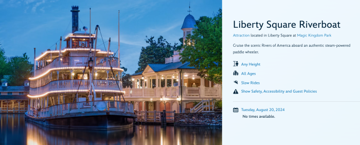 The Liberty Square Riverboat, which cruises the Rivers of America around Tom Sawyer Island is not showing any hours on the Disney World calendar as of of August 20th. This generally means that the ride will be closed. We’re seeing the same on August 21st and 22nd.