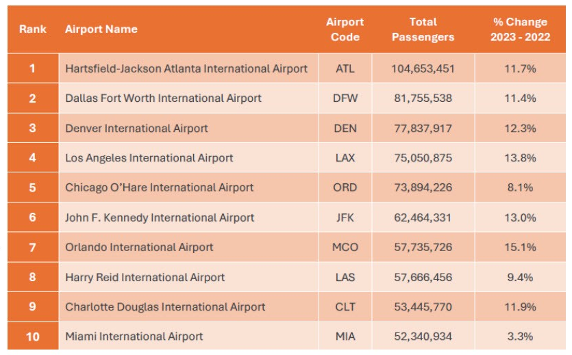 The Airports Council International North America (ACI-NA) recently released their 2023 Traffic Summary. This report summarizes data about “passenger, cargo, and aircraft operations data from 275 North American airports.” In this report, Orlando International Airport (MCO) was ranked as the 7th busiest airport in the United States for passenger traffic. MCO over a 15% increase in passenger traffic which was the largest growth for U.S. airports. Globally, Orlando International Airport ranks 18th among international traffic totals.
