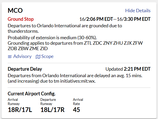 The Federal Aviation Administration reported that “Departures to Orlando International are grounded due to thunderstorms.” The current probability of extension is listed as “medium” (30-60%), but the ground stop is expected to end at 4:30PM.