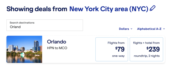 For example, as part of the sale, JetBlue is offering flights from New York’s Westchester County Airport to Orlando International Airport starting at $79 one way, and 2-night roundtrip flight and hotel packages between the same two destinations from $239.