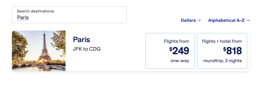 There are also international flights available. For example, the airline is offering flights from New York’s JFK Airport to Paris for rates as low as $249 one-way, and $818 for a roundtrip flight & hotel package.