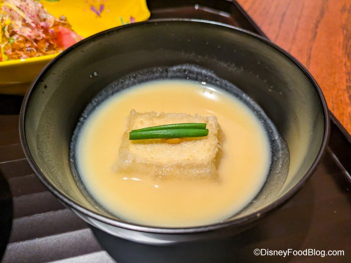 The soup turned out to be our favorite thing on the plate. Miso soup is typically made with red miso, but this one is made with white miso, which makes it creamier. It still has the savory complex qualities of miso, and the tofu soaks up those flavors nicely. This was one of those things that was good on the first bite. We also liked the paper -thin breading on the deep-ried tofu, plus the added touch of wasabi. This was an amazing way to kick off our meal.