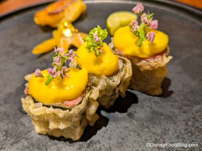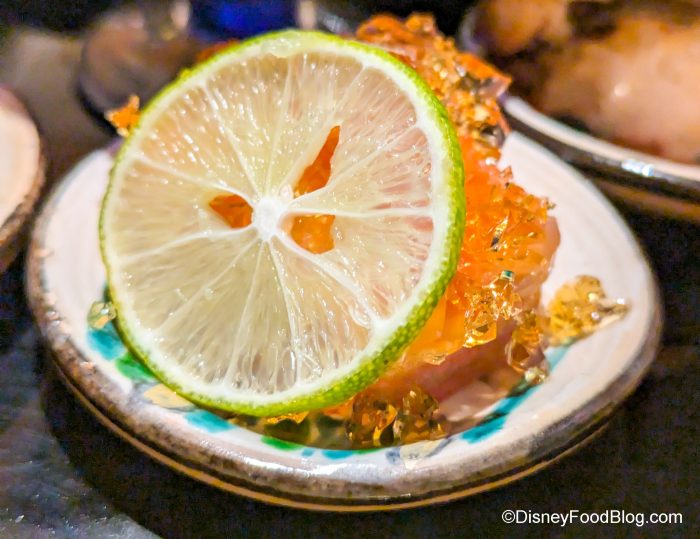 The wagyu was amazing and we loved the yuzu salt that’s on the plate. It’s housemade, and it’s a lot like a citrus salt. The lime and that yuzu salt change the flavor of the wagyu, too, so you’re encouraged to try it with and without the salt.