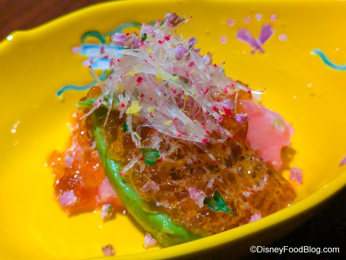 Then it was onto the tuna, avocado, and zucchini with ponzu jelly. We enjoyed this tuna salad. We will say this is a more familiar fish flavor, so if you’ve eaten a spicy tuna roll, you might recognize the taste of this and be more comfortable with it. It has the minerality of tuna. We liked how the textures varied: you’ve got the crunch from the zucchini, the fatty structure of the avocado mixed with the tuna, and the gelatinous ponzu jelly.