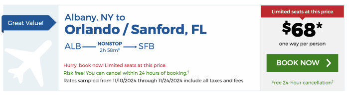 Depending on where you live, Allegiant may offer flights to Orlando International Airport or to Orlando Sanford International Airport. Both of these airports are great options to fly into to get to Disney World. Now, we spotted a sale going on for the many locations offering Allegiant flights to one or both of these destinations! For example, if you’re flying from Albany, NY, you can get tickets for as low as $68 one way!