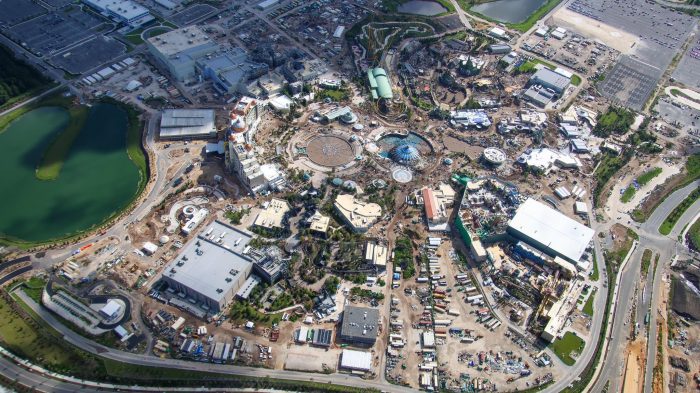 One of the pictures features an aerial overview of Epic Universe from 1700 ft, detailing some of the updates and changes added to the upcoming theme park like a red/yellow canopy inside of Viking Training Camp at The Isle of Berk, seen at the top right.