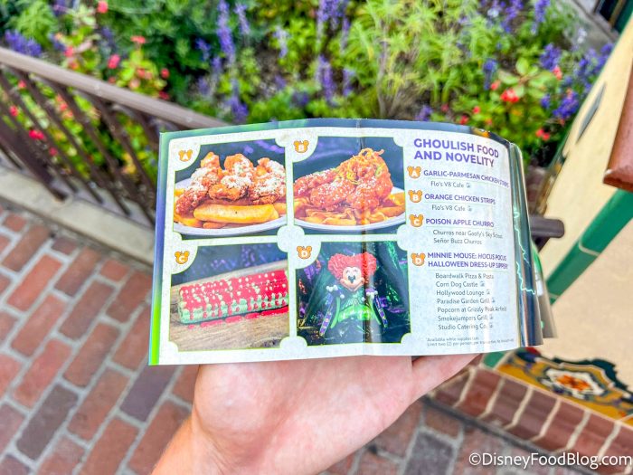 When you unfold the first part of the map, you’ll stumble across some Disney+ and Hulu ads. But the most important part here is the food and novelty section! While Oogie Boogie Bash keeps several restaurants in the park open, there are only a few exclusive items at the event. The list includes: