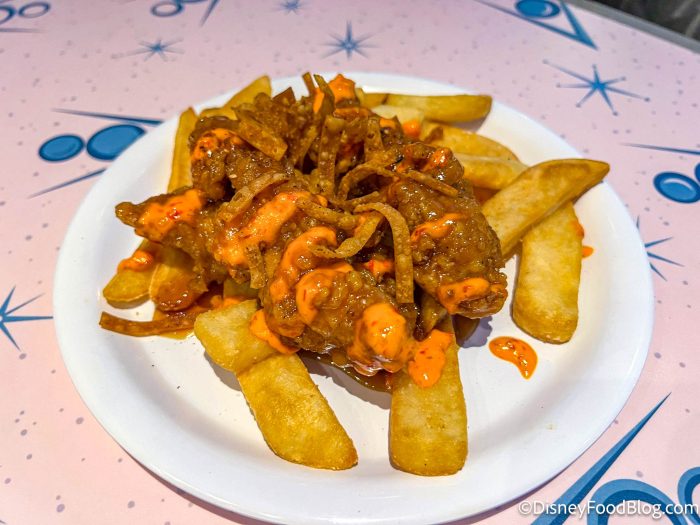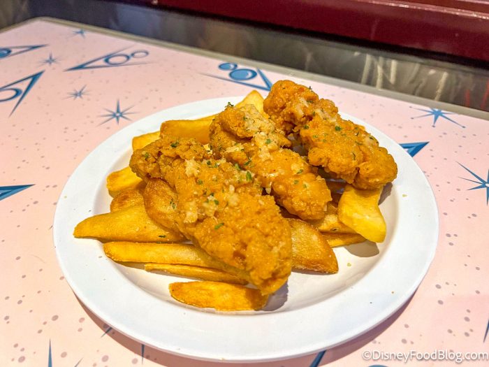 So let’s look at the exclusive eats available at the party. First we’re cruising into Cars Land to check out the Garlic-Parmesan Chicken Strips for $13.49 at Flo’s V-8 Cafe. These were just fine. It was a little on the greasy side and the garlic was VERY strong, taking away from most of the parmesan flavor. The fries were also pretty greasy from sitting underneath the chicken.