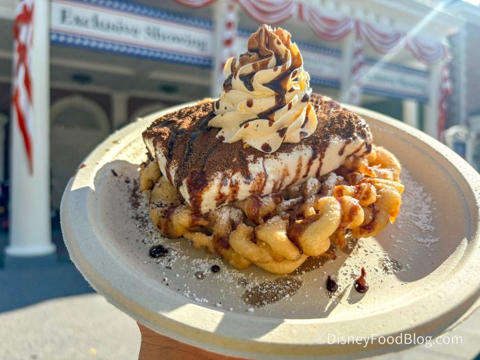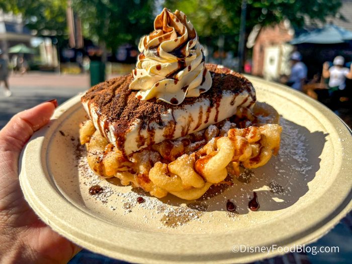 Be warned — although you get a generous portion of ice cream, it melts almost immediately under the hot Florida sun. Personally, we didn’t mind when our ice cream melted. If anything, it made the funnel cake BETTER! We loved the way the ice cream made the funnel cake soft and spongy — it added a bit of moisture to a dry, otherwise crunchy dessert. That said, if you don’t like melted ice cream on your funnel cake, you might want to skip this one.