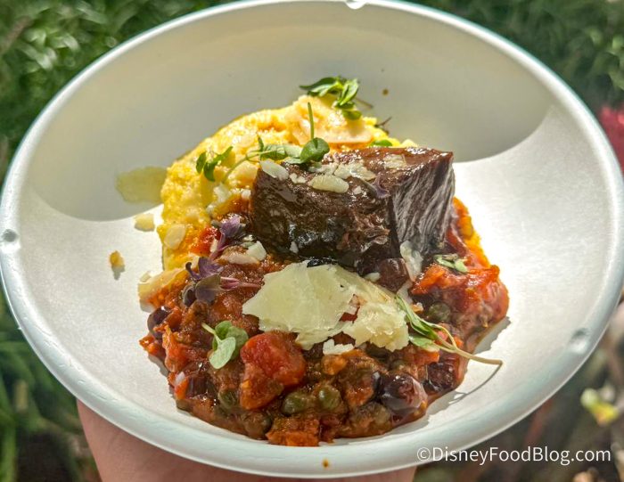 The new Red Wine-braised Beef Short Rib is plated with goat cheese polenta, puttanesca sauce, shaved pecorino, and petit herbs.