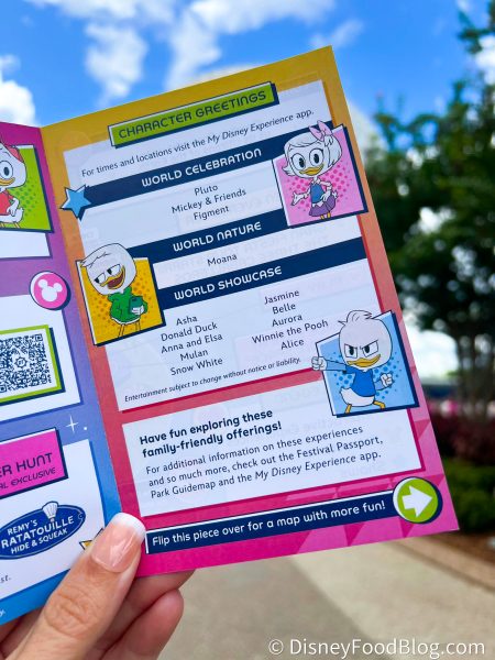 When entering EPCOT, one of our reporters went to retrieve their own Festival Passport when they noticed that a new guide was on display and available for all guests to take with them. This new guide is called “Fun For Families With Kids” and has our favorite duck pals from DuckTales shown all throughout it!