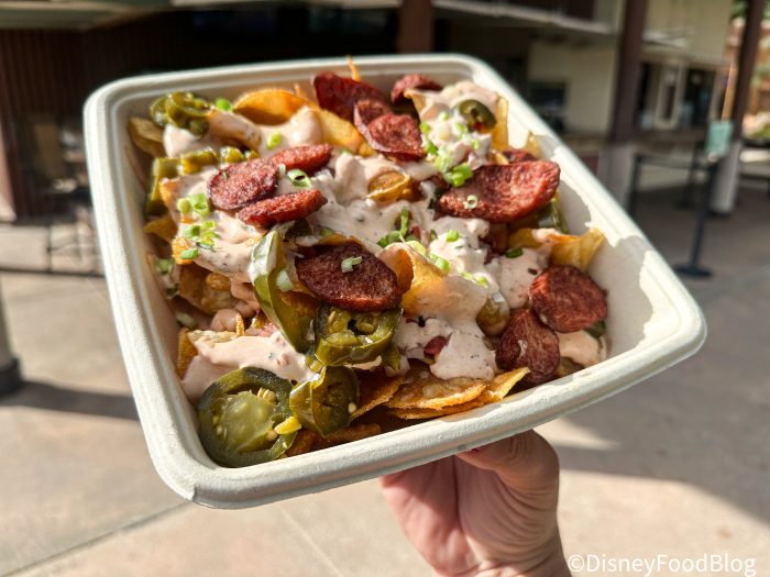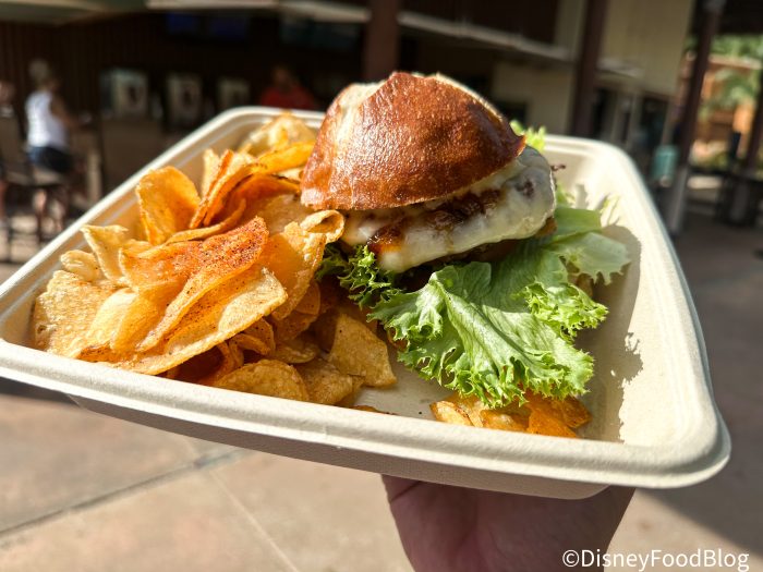 The kettle chips are the house-made chips we’ve seen around several quick service restaurants at Disney World hotels and they’re topped with that same spicy chipotle aioli we had on the mac & cheese bites. We have to admit though there was more of it on these chips and we underestimated the heat from the chipotle at the first bite.