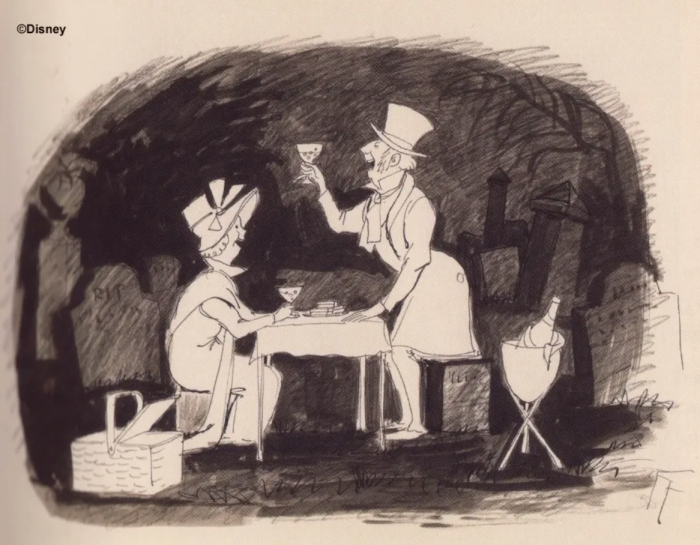 This poor man, though, seems to be having a picnic all by himself. How sad! However, he’s not supposed to be alone, as seen in this Haunted Mansion concept art. He’s supposed to be having a picnic with a lady friend.