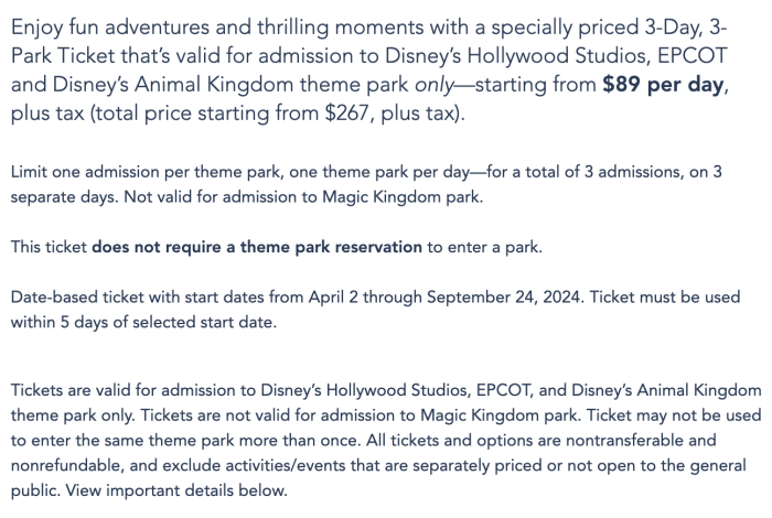 The other ticket option available until September 24th is the 3-Day, 3-Park Ticket. This ticket starts at $89 per day, plus tax, and gives you admission to EPCOT, Disney’s Hollywood Studios, and Disney’s Animal Kingdom. This ticket does NOT give you admission to Magic Kingdom. You get a total of 3 admissions on 3 separate days, one admission per park.
