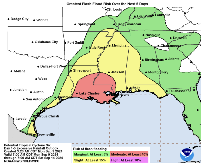 Potential Tropical Cyclone 6 will likely bring heavy rainfall and the risk of considerable flash flooding. The risk for flash flooding may impact Mexico, Texas, and Louisiana as well as areas across the Mid-South US.