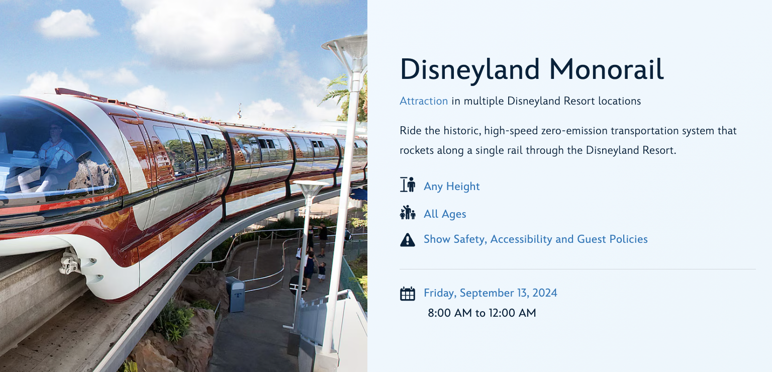 But now, we know when the Monorail will reopen! According to the Disneyland website, the Monorail has operating hours again starting on September 13th. On that day, it will be open from 8AM-midnight.