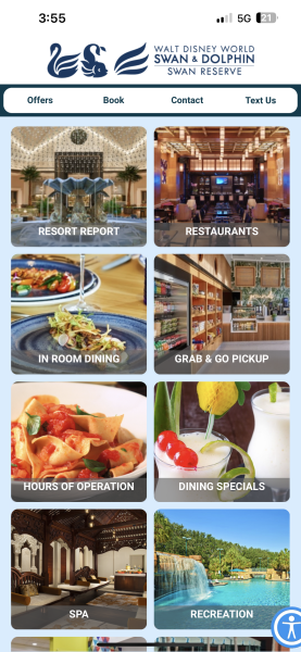 Since these hotels are owned by Marriott and not Disney, they have their own app. You can download the Walt Disney World Swan and Dolphin mobile app to keep track of your reservation and to see things like restaurant menus and amenity hours. It is also where you can order In-Room Dining! This is a feature even the My Disney Experience app (Disney World app) doesn’t have for Disney’s hotels.