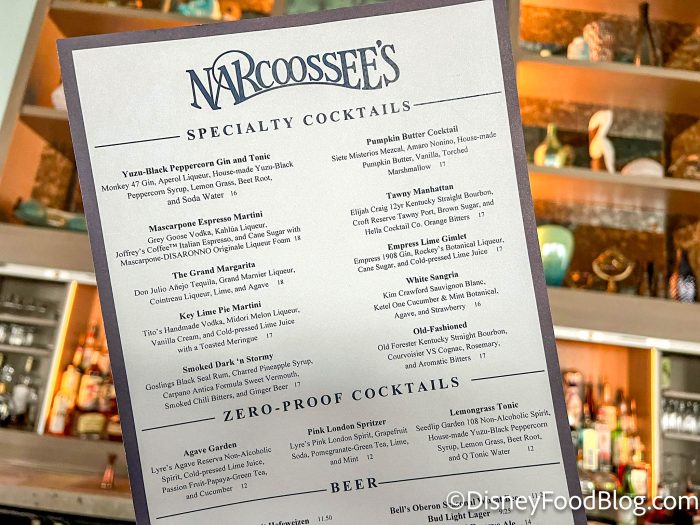 Recently we stopped by Narcoossee’s at Disney’s Grand Floridian Resort to try out their Pumpkin Butter Cocktail. This drink is $17 and made with Los Siete Misterios Mezcal, Amaro Nonino, house-made pumpkin butter, vanilla, and topped with a torched spiced marshmallow.