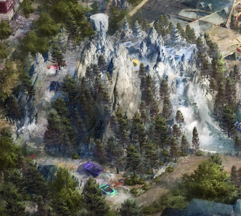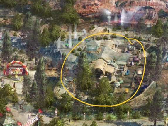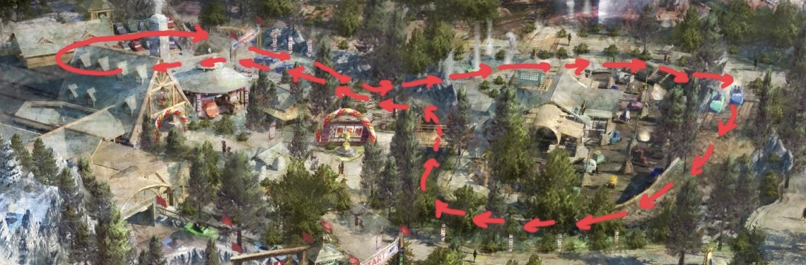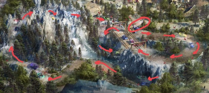 Now, moving on to the more “family-friendly” ride at the “top” of the concept art, this was a bit more difficult trying to figure out the potential path for the ride, but here’s a best guess.